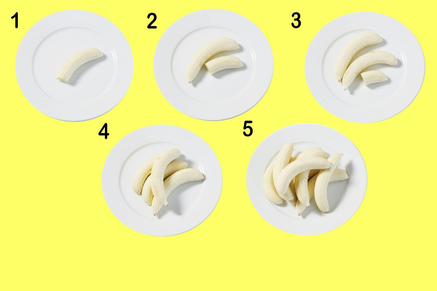 Bananer: 1. 50 kalorier = 61 gram 2. 100 kalorier = 122 gram 3. 150 kalorier = 183 gram 4. 250 kalorier = 305 gram 5. 500 kalorier = 610 gram