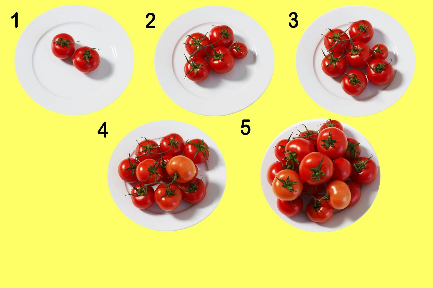 Tomater: 1. 50 kalorier = 192 gram 2. 100 kalorier = 385 gram 3. 150 kalorier = 577 gram 4. 250 kalorier = 992 gram 5. 500 kalorier = 1923 gram