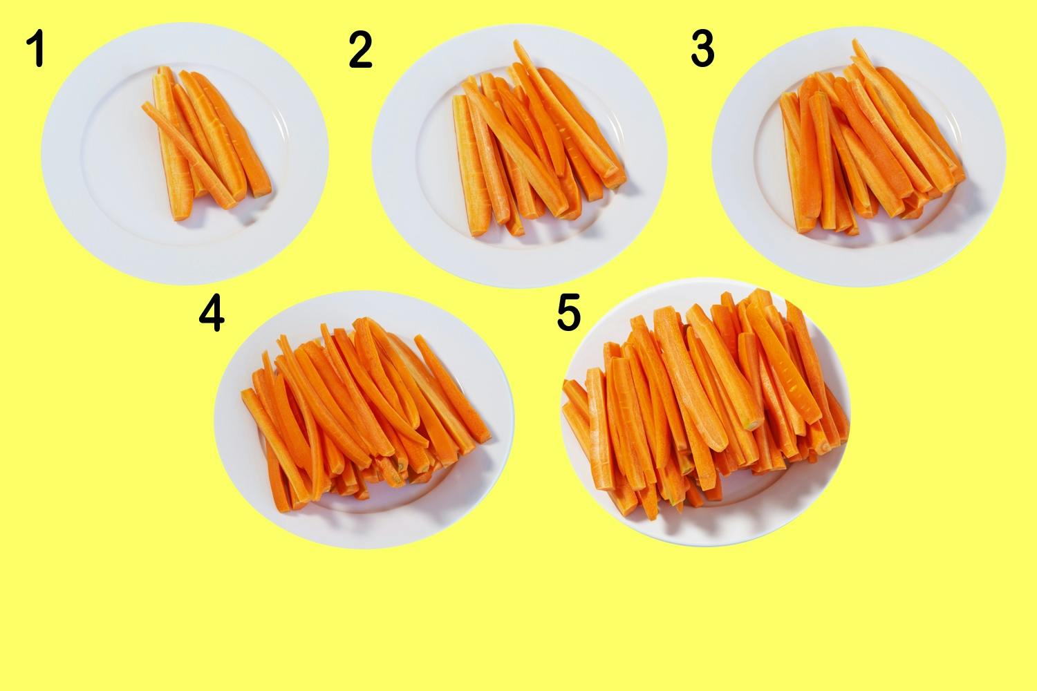 Gulrøtter: 1. 50 kalorier = 139 gram 2. 100 kalorier = 278 gram 3. 150 kalorier = 417 gram 4. 250 kalorier = 694 gram 5. 500 kalorier = 1389 gram