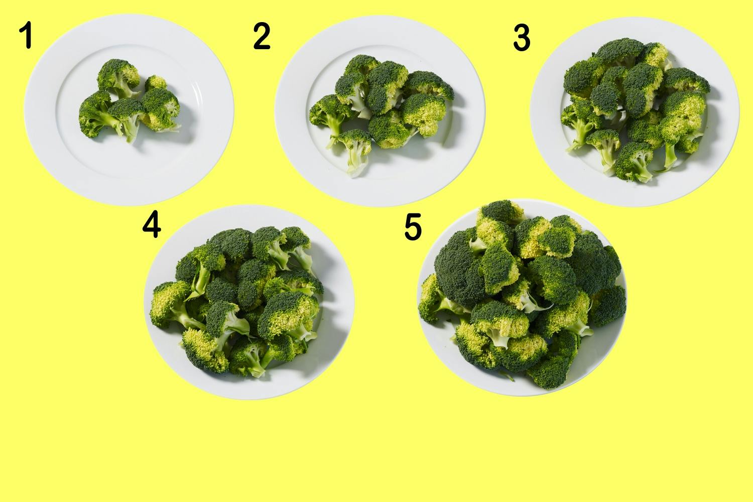 Brokkoli: 1. 50 kalorier = 111 gram 2. 100 kalorier = 222 gram 3. 150 kalorier = 333 gram 4. 250 kalorier = 556 gram 5. 500 kalorier = 1111 gram