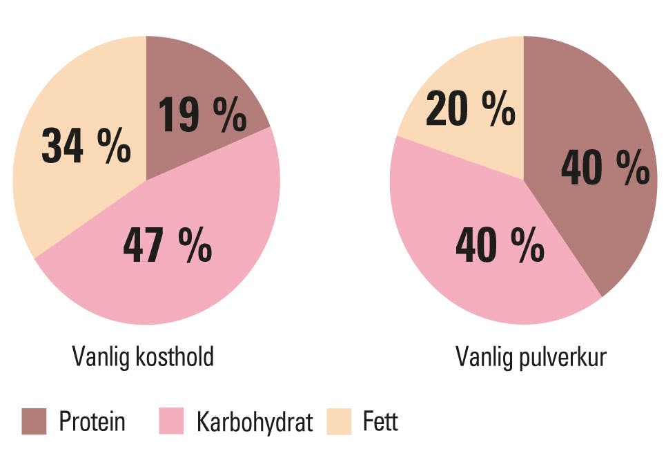I en vanlig pulverkur kommer dobbelt så mange av kaloriene fra protein som i et vanlig kosthold, mens fett bidrar med 40 prosent mindre.