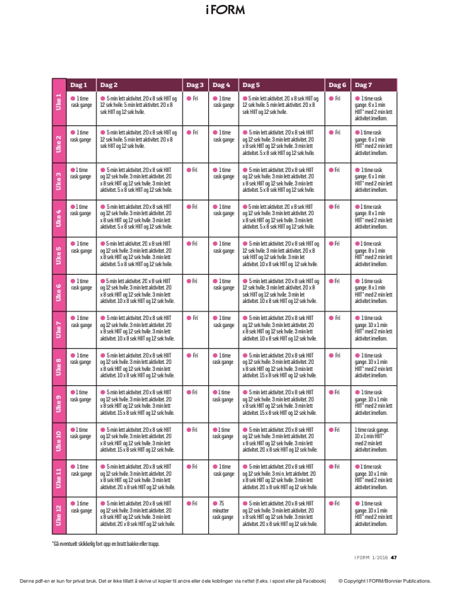Programmet er basert på en kombinasjon av gange og ergometersykling (HIIT), men aktivitetene kan fint tilpasses egne ønsker.
