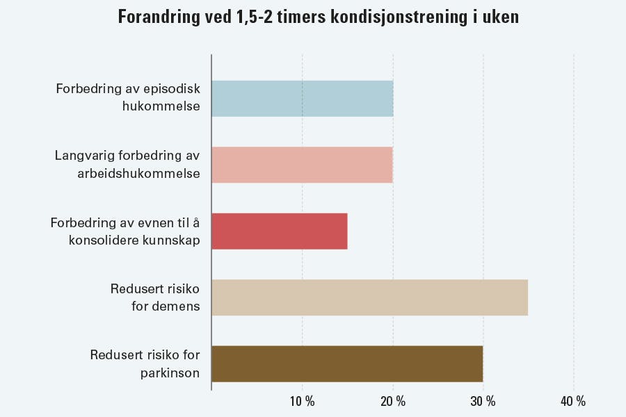 Kondisjonstrening er et kinderegg med ekstra sjokolade og leker når det gjelder hukommelse og hjernehelse. Her kan du se effekten av 1,5-2 timers ukentlig kondisjonstrening gjennom hele livet (som et minimum).