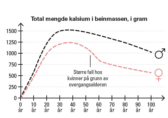 Når vi plutselig ikke produserer like mye østrogen lenger, reduseres beinmassen merkbart. For menn er tapet jevnere gjennom hele livet.