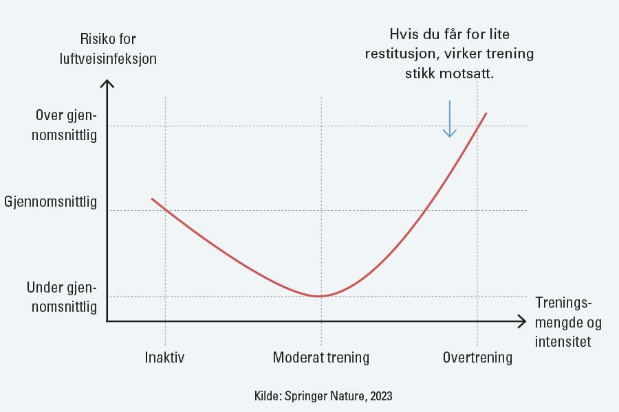 Dette fremgår av en mye sitert studie fra 2002. Forskerne undersøkte risikoen for å pådra seg en infeksjon i de øvre luftveiene – forkjølelse, halsbetennelse, bihulebetennelse og så videre – hos 547 personer, og konkluderte med at de som trente moderat til hardt, hadde 20 prosent lavere risiko for å bli syke i løpet av et år sammenlignet med dem som ikke trente.