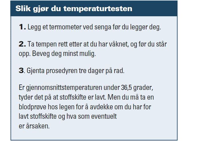 Hvis du er ekstra frossen og sliter veldig med å få varmen helt ut i hender og føtter, kan det være tegn på at stoffskiftet ikke fungerer som det skal. Når kroppen bruker mer tid på å omdanne næringsstoffer som proteiner, karbohydrater, fett og vitaminer til energi, blir blodsirkulasjonen merkbart dårligere, og dårlig blodsirkulasjon fører til lavere kroppstemperatur. Ved å måle temperaturen i flere omganger – også kjent som The Basal Temperature Test – kan du få en indikasjon på om stoffskiftet fungerer på lavbluss.