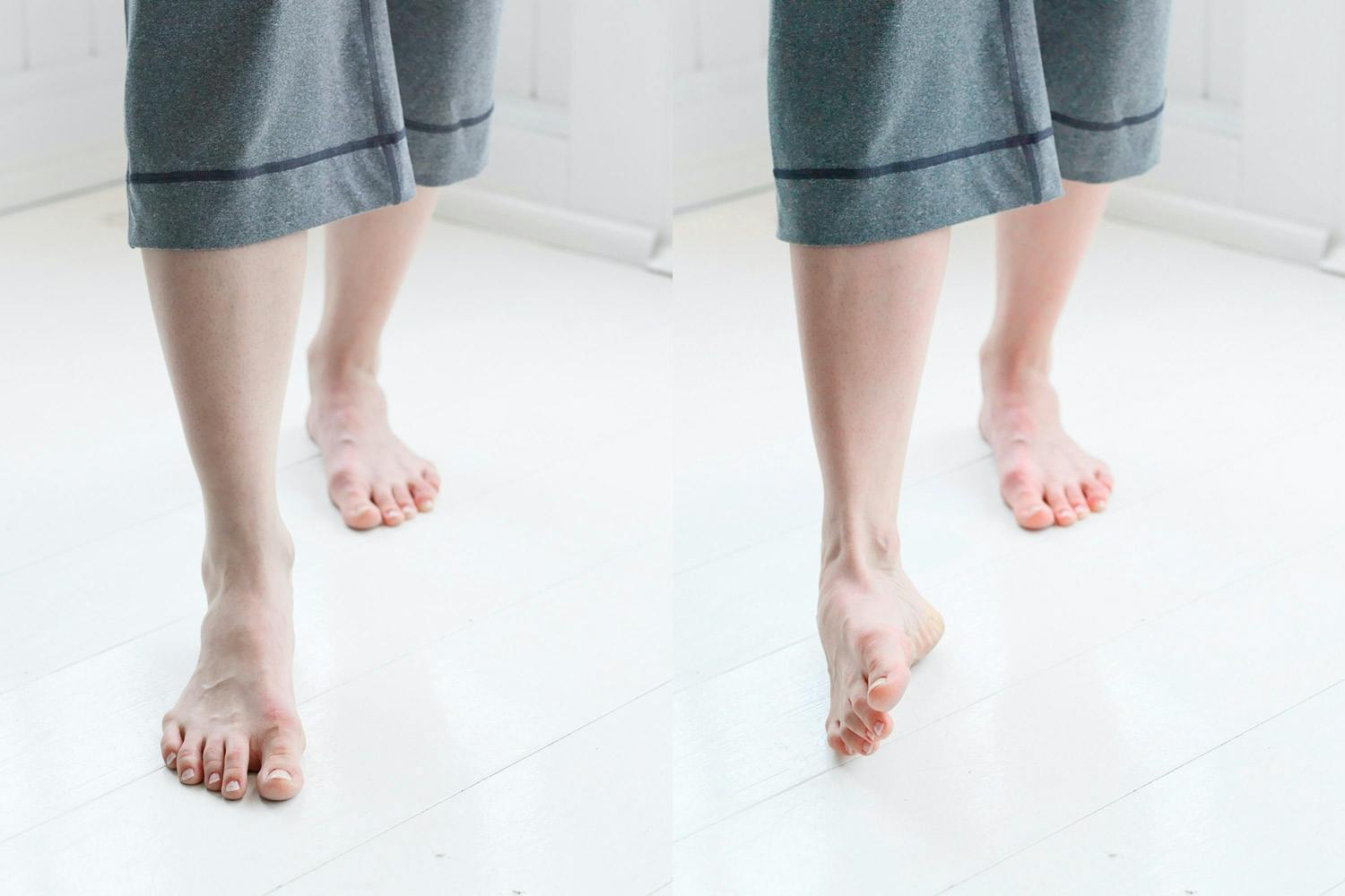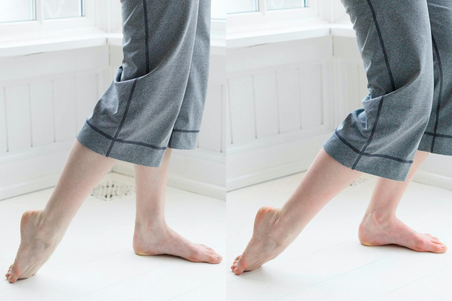 • Gå litt ned på den foten du står på slik at du kjenner et lett strekk på den bakerste vristen.