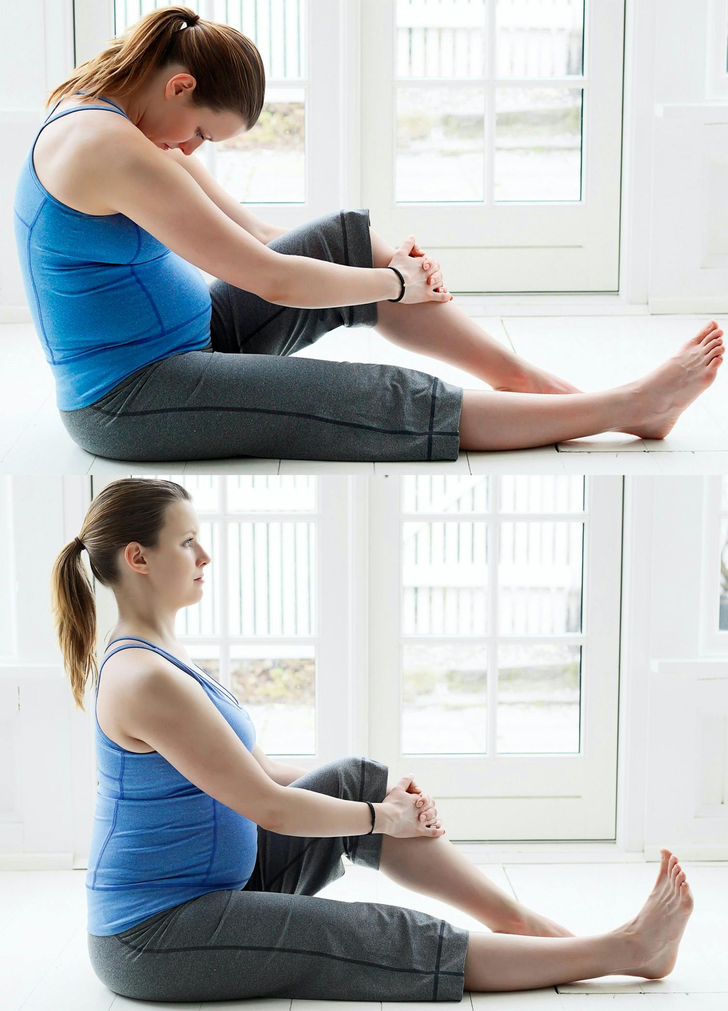 Sitt på gulvet eller på kanten av en stol. Hold deg fast i det ene kneet, slapp av i skuldrene.