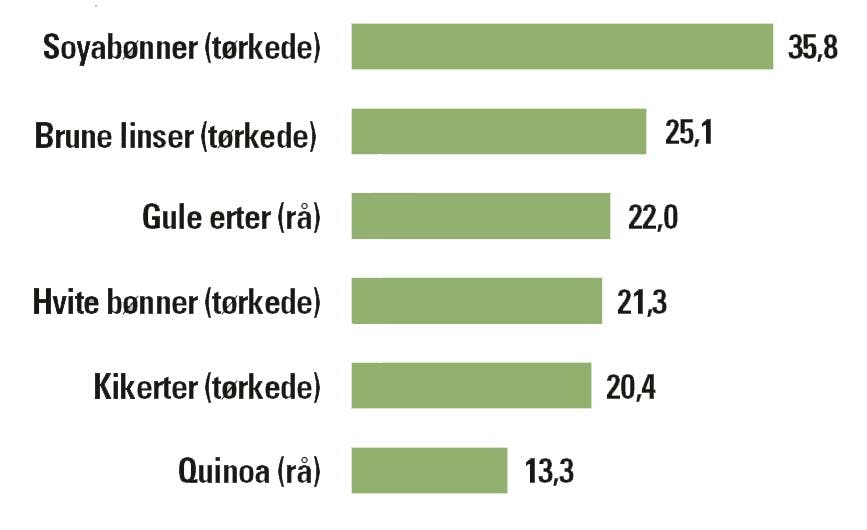 Dersom du er vegetarianer eller veganer, er det heldigvis også mange gode proteiner å hente ved å spise soyaprodukter, quinoa, belgfrukter, nøtter og fullkorn. Det krever imidlertid at du har god appetitt, for du må spise temmelig mye for å dekke proteinbehovet.
