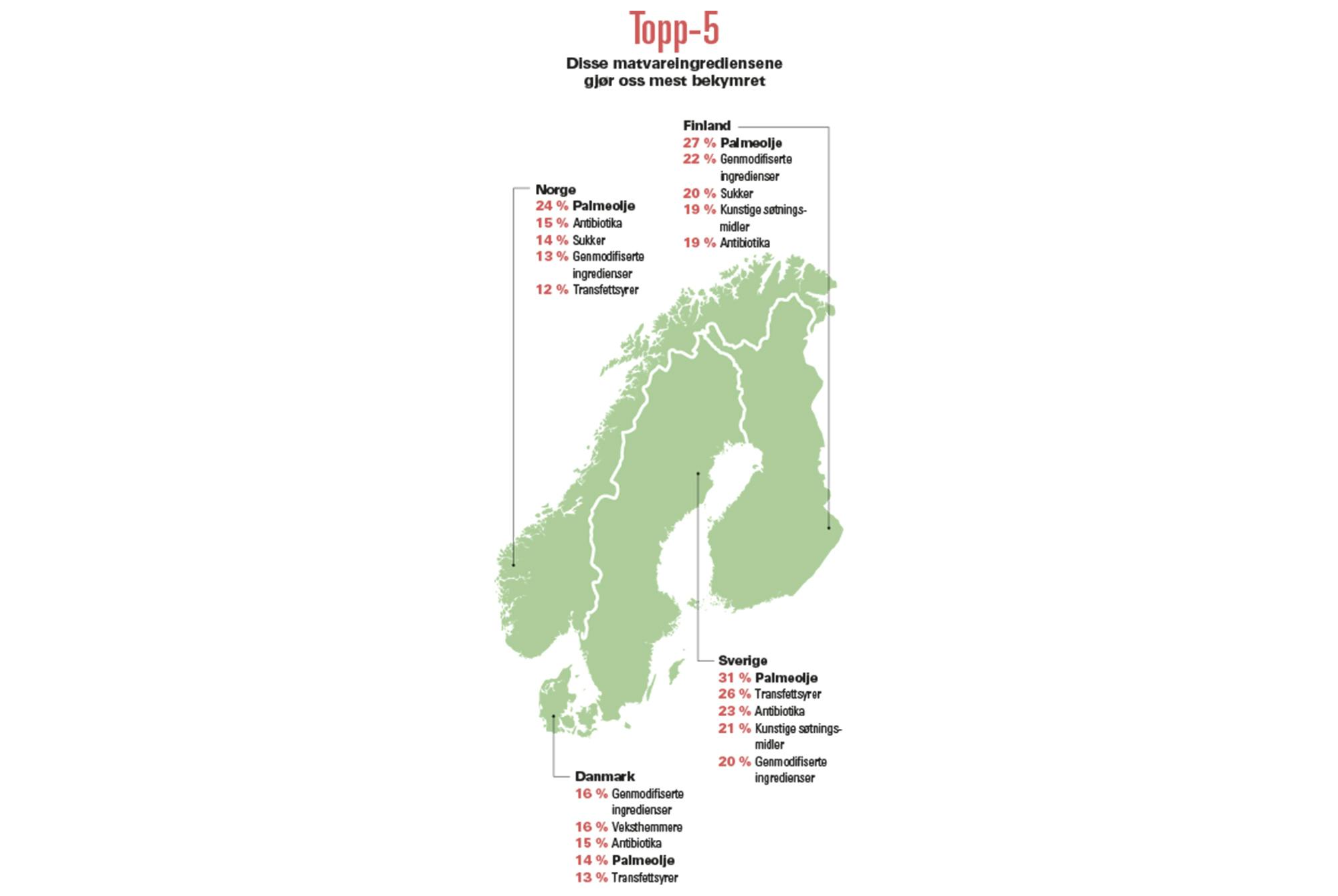 I Sverige og Finland er for eksempel hver femte bekymret for kunstige søtningsmidler. Denne ingrediensen er ikke å finne på verken vår eller danskenes topp-5-liste over bekymringer.