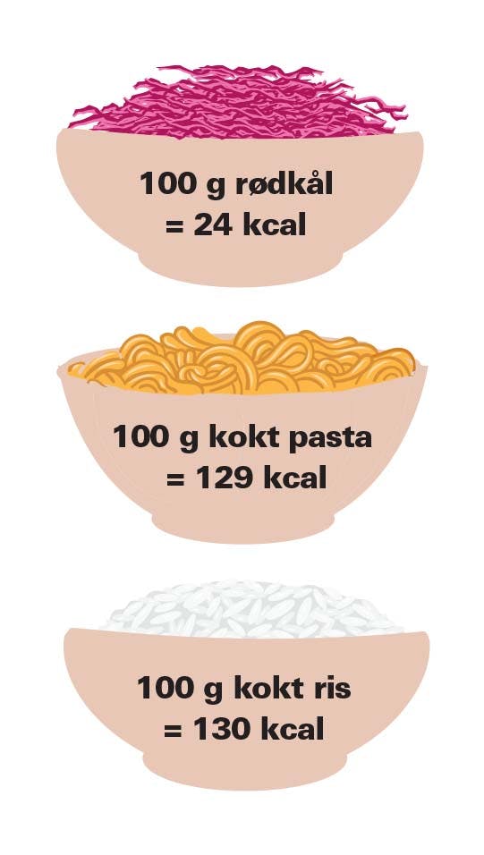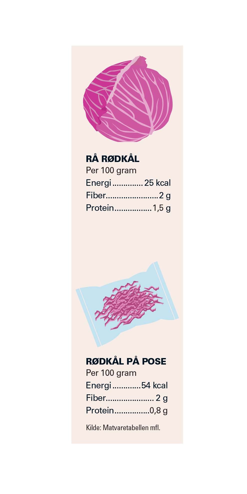 Rå rødkål inneholder mer fiber og mer C-vitamin enn den på pose, som ofte er tilsatt sukker og dermed også flere kalorier. Se eventuelt om du finner kjøpevarianter uten tilsatt sukker.