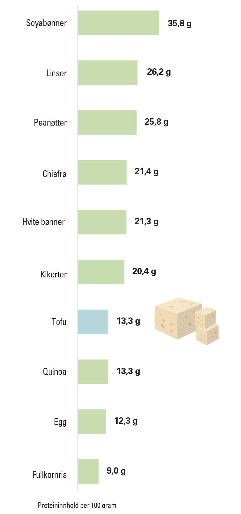 Det er cirka 13 gram protein i 100 gram tofu, mens det er cirka 20 gram protein i magert oksekjøtt og kylling. Det betyr at du må spise cirka 33 prosent mer tofu for å få like mye protein som fra kjøtt. Hvis du bytter ut kjøtt med tofu, kan det være nødvendig å ta et kosttilskudd med D- og B12-vitamin.