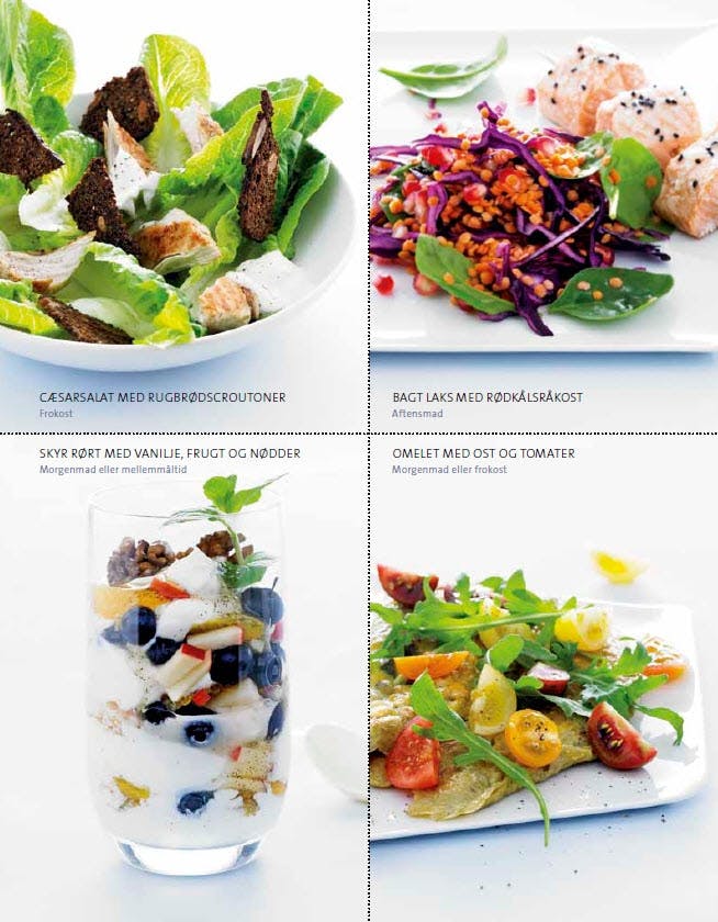 Last ned matkort med lekre oppskrifter til ovnsbakt laks med rødkålsråkost, Cæsarsalat, omelett med ost og tomater, skyr rørt med vanilje, frukt og nøtter.