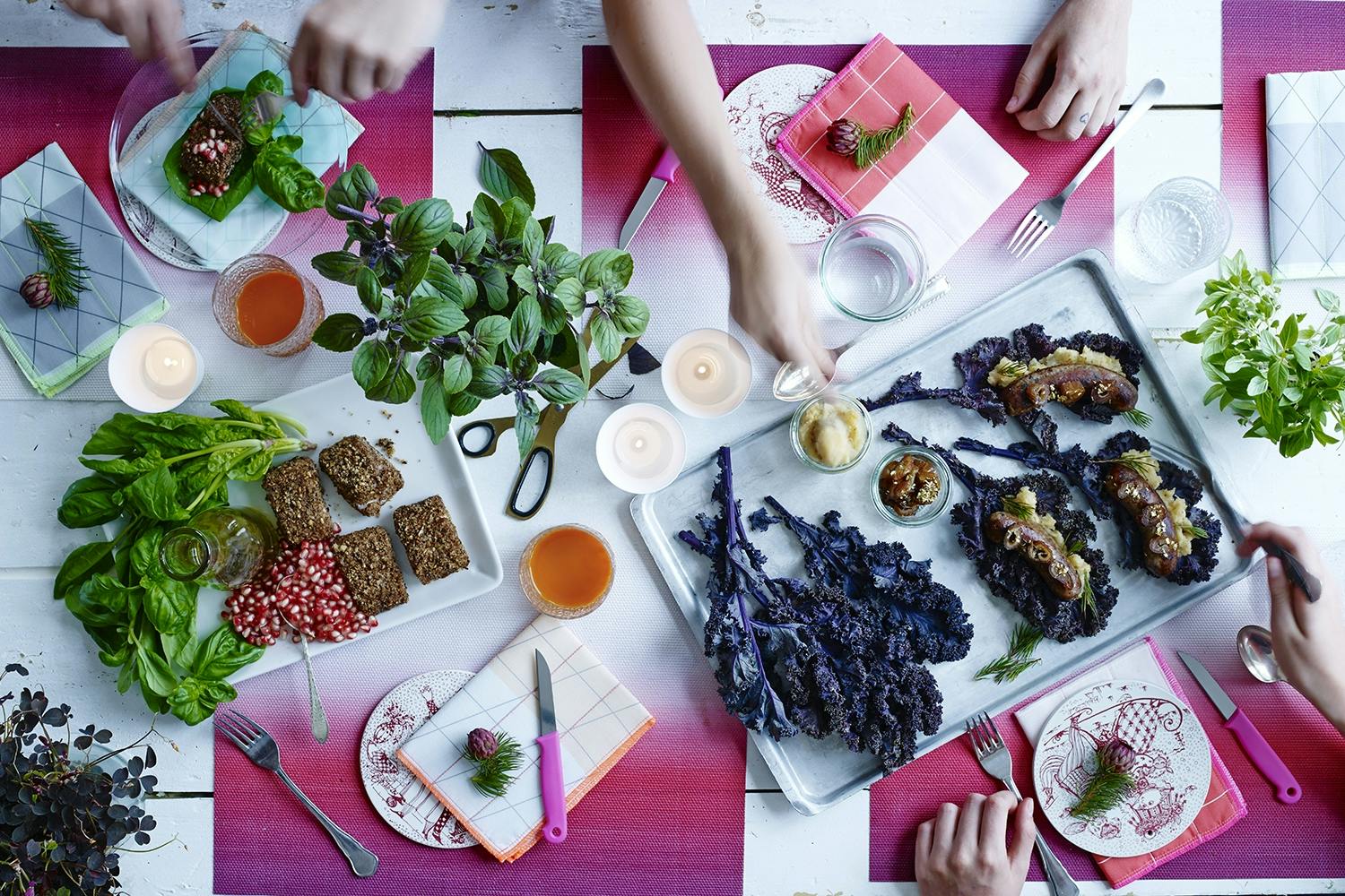 Det går med mengder av friske krydderurter til denne julelunsjen. Sett dem på bordet i små potter med saks ved siden av, og la gjestene klippe selv. Her har vi brukt thaibasilikum, estragon, ananasmynte, rød gaukesyre og brønnkarse.