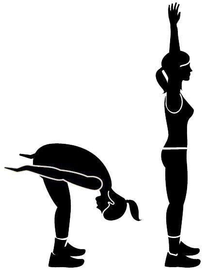 Stå med føttene i hoftebreddeavstand og sving armene ned mot gulvet, mens du krummer ryggen. Sving armene opp mot taket, mens du retter opp ryggen. 20 repetisjoner.