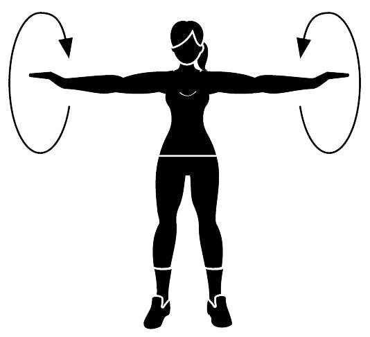 Stå med føttene i hoftebreddeavstand. Strekk armene vannrett ut til sidene og tegne store sirkelbevegelser i lufta. Hold et godt tempo. 20 repetisjoner.