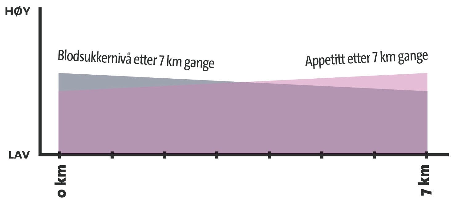 Når du driver med lavintensiv mosjon som gange, henter kroppen en stor del av drivstoff et fra fettlagrene. En liten reduksjon i fettlagrene truer ikke kroppen nevneverdig og får ikke blodsukkeret til å falle – og dermed sendes det heller ikke sultsignaler til hjernen.