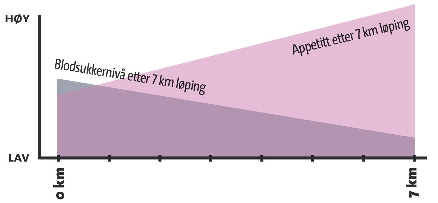 Når du trener hardt, henter kroppen en stor del av drivstoff et fra karbohydratlagrene (sukkerlagrene) i musklene og blodet. Det får blodsukkeret til å falle, og du føler deg mer sulten fordi et fallende blodsukker er et signal om at det er i ferd med å bli mangel på mat.
