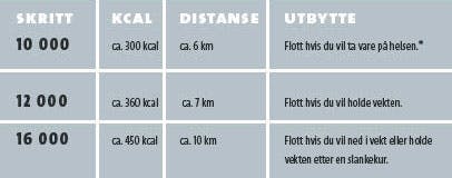 De fleste av oss vet godt at vi helst bør gå 10 000 skritt om dagen, og det er supert hvis vi snakker om å ta vare på helsen. Undersøkelser viser likevel at det må litt mer til hvis du vil bruke gange som slankemosjon. Men husk at alt teller med! Du behøver ikke gå alle skrittene som egne gåturer, for du kan alltids få satt inn noen skritt på kontoen ved å sørge for å alltid være den som går ut med søppelposen eller henter epler i kantinen.