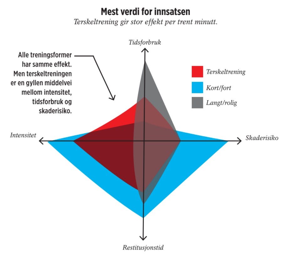 1. For det første gir terskeltreningen mulighet for å trene en større mengde ved relativt høy intensitet og dermed få større effekt av treningen. Litt forenklet er det to parametere som avgjør hvor effektiv treningen er: intensitet og volum. Jo hardere og jo lengre treningen er, jo mer får du ut av den. Utfordringen er naturligvis at vi også må ta hensyn til skaderisiko og restitusjon, og derfor er nødt til å holde igjen på en av de to parameterne. Trener du ekstremt harde intervaller som for eksempel HIIT-trening, kan du bare gjøre det noen få minutter i uka hvis kroppen skal tåle det. Løper du derimot bare rolig, må du ut på noen veldig lange turer for å oppnå samme effekt som av den høyintense treningen. Terskeltrening er den gylne middelveien mellom de to ytterpunktene og gir deg både ganske høy intensitet og ganske høyt volum, og dermed et svært høyt utbytte av treningen.