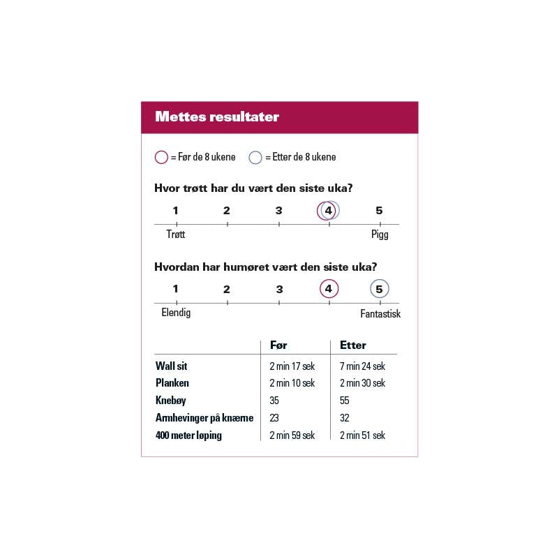 Både før og etter de 8 ukene fylte Mette ut et kort spørreskjema, og personlig trener Christina Heick testet hennes styrke og kondisjon. Her ser du hvordan det gikk: