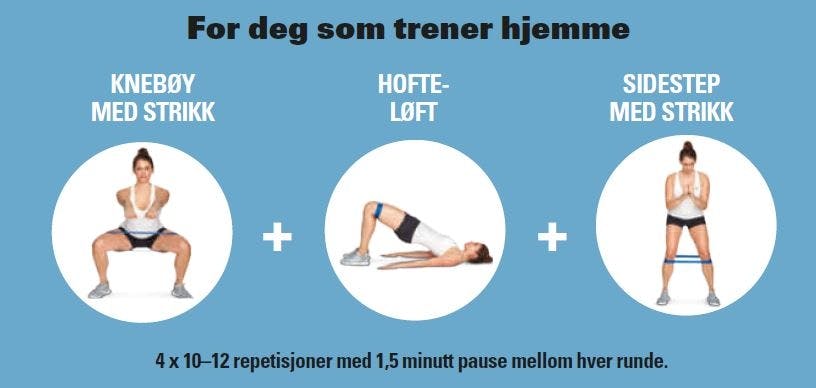 Repetisjoner: 3–5 runder à 10–12 repetisjoner per bein. Ta 11/2 minutt pause mellom hver runde.