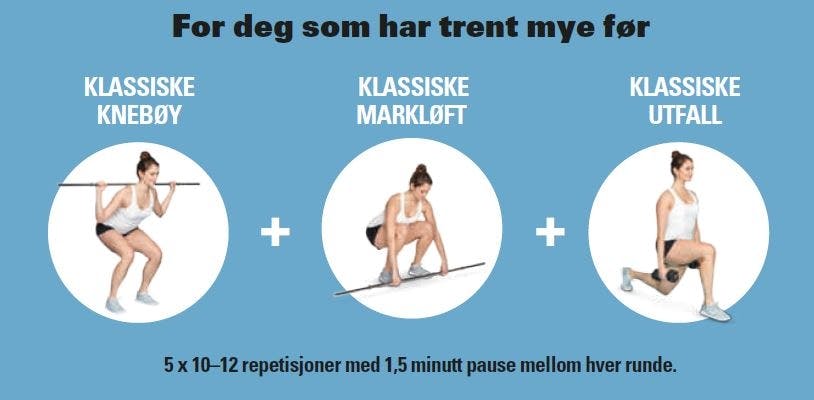 Til hver treningsøkt velger du én type knebøy, én type markløft og én type utfall. Det er opp til deg om du vil sette sammen de tre øvelsene selv eller om du velger et av programmene.