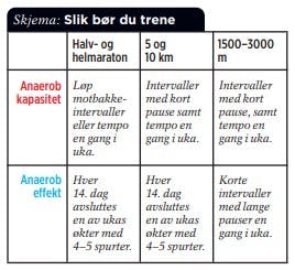 Den anaerobe kapasiteten trenes opp ved gjentatte ganger å jobbe over grensen der musklene får melkesyre, og gi dem så kort pause at de ikke helt rekker å komme seg. Det kan du gjøre ved å løpe for eksempel 10 x 30 sek. med 1 min. pause mellom hvert intervall. Klassiske tabata-intervaller, der du løper 8 x 20 sek. med 10 sek. pause, er også god trening av den anaerobe kapasiteten.