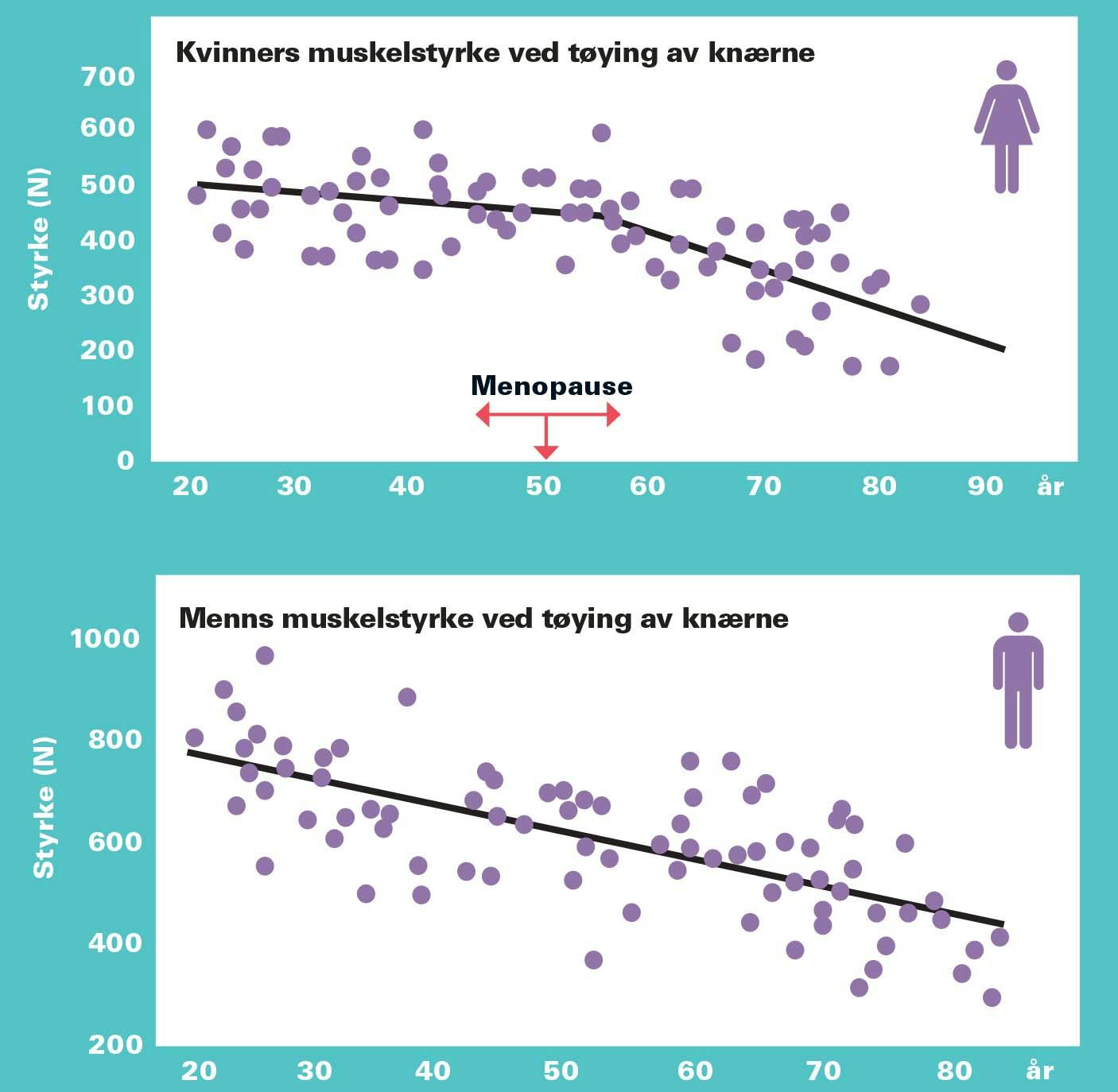 Vi blir født, vokser opp, blir voksne, og så – allerede i slutten av 20-årene – begynner det å gå sakte nedover. Spesielt med byggesteinen til musklene: muskelmassen. Mens menn mister muskelmasse jevnt og trutt, er kurven for kvinner nærmest i fritt fall når vi kommer i overgangsalderen og østrogen- fabrikken stenger. Da føles handleposene tyngre, det blir hardere å gå i trapper og – med tiden – å reise seg fra en stol.
