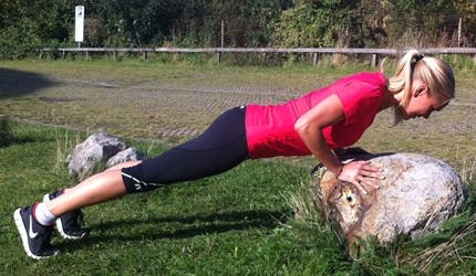 Trening Styrketrening Styrketreningsøvelser 3. Armhevi... 3. Armheving Slankeøvelse på løpeturen - ta en armheving. Av I FORM-redaksjonen 11. oktober 2011 Start med f.eks. 10 av hver - hvis du kan. Ta flere etter hvert som du blir sterkere! Legg til favoritter Fjern fra favoritter Armheving: Startposisjon Finn en lav mur, benk eller lignende. Innta en skrå stilling med hendene på muren og tærne i bakken. Hold kroppen rett og armene strake. Armheving: Bevegelsen Bøy armene til brystet nesten rører ved muren/benken. Strekk armene langsomt igjen. Se neste øvelse