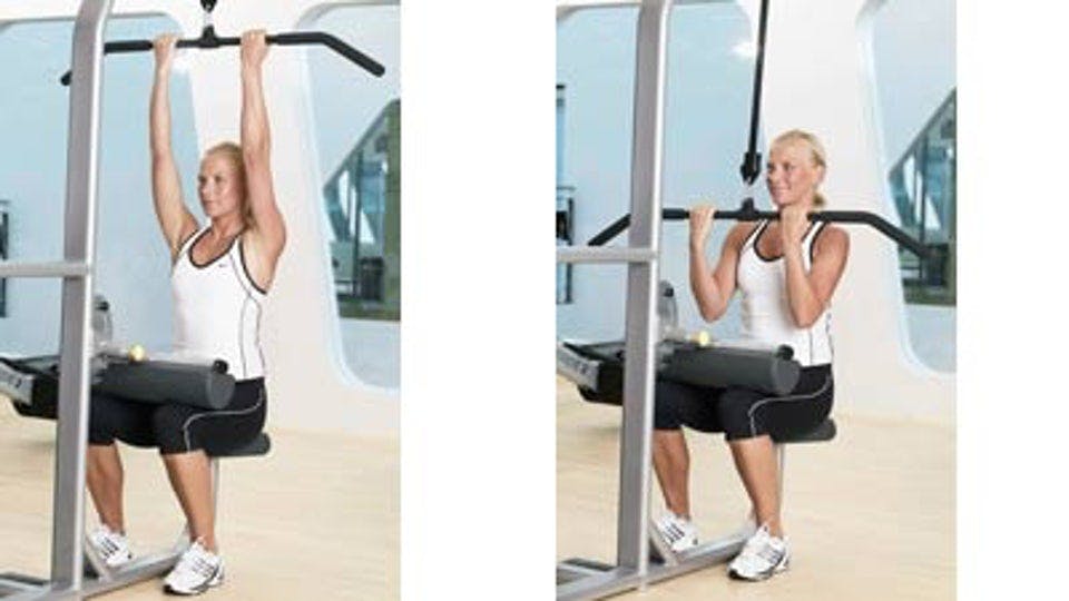 Slik gjør du det: Ta tak rundt stangen slik at fingertuppene vender inn mot kroppen. Du kan også vende hendene utover hvis det er bedre. Trekk stangen nedover til den er ved kragebenet. Før stangen langsomt oppover igjen til startposisjonen.