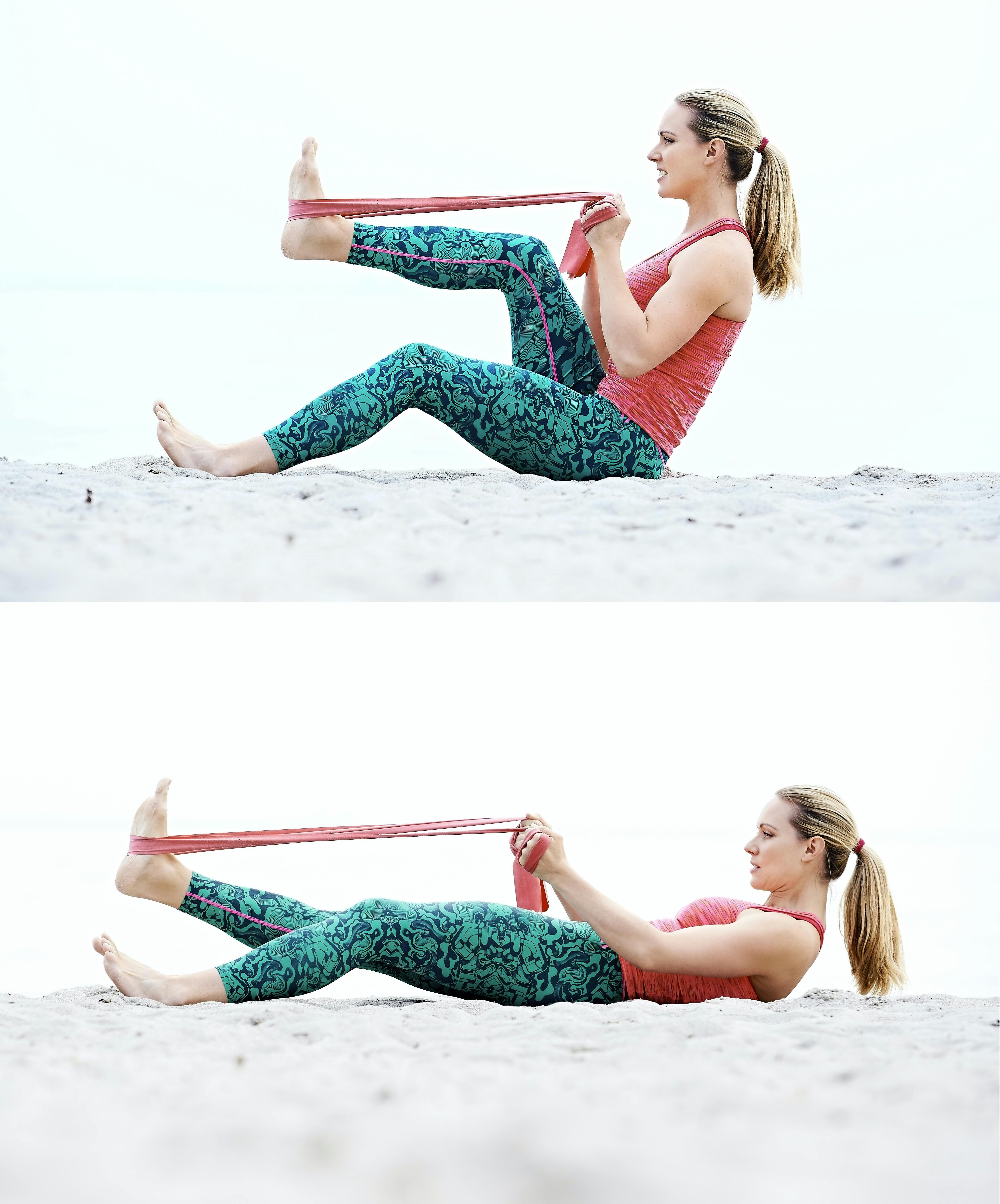 Pust inn, og senk deg langsomt bakover ved å rulle ned gjennom ryggen, samtidig som du strekker det løftede beinet med strikken foran deg. Press korsryggen ned i gulvet, men hold hodet oppe. Pust ut, og gå langsomt opp til sittende stilling igjen. Det skal hele tiden være en lett motstand i strikken, men jo mindre stram strikken er i denne øvelsen, desto hardere blir den. En helt stram strikk gir foten noe å spenne mot, og det gjør det lettere å komme opp i sittende stilling.