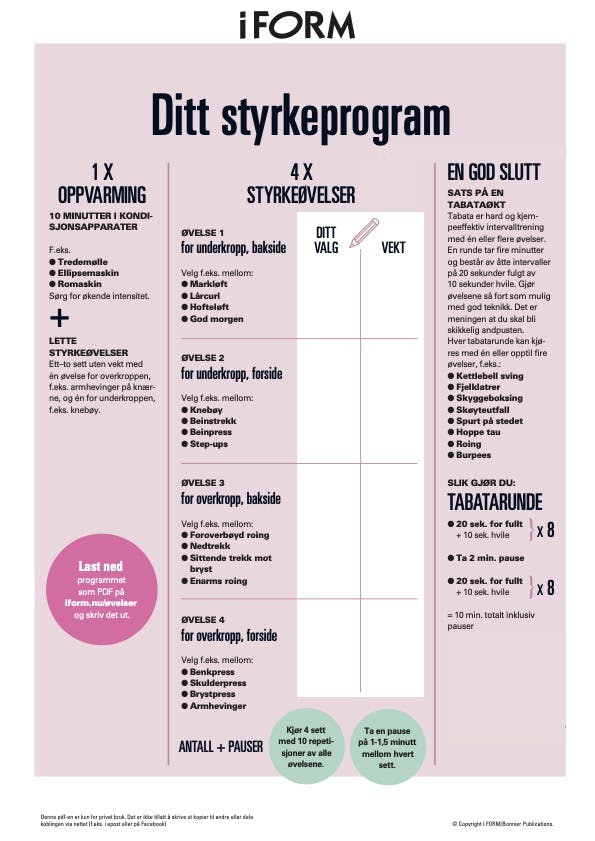 For å bli sterkere er det også viktig å øke belastningen. Har du kjørt det oppgitte antallet repetisjoner og klarer mer enn to til, bør du øke belastningen. Går det ikke, kan du alltid gå tilbake til den opprinnelige vekta, men du klarer det garantert bare du presser deg litt. Prøv, så ser du.