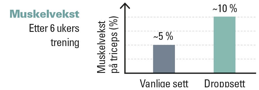 I et forsøk hvor deltakerne gjennomførte seks ukers trening med øvelsen tricepspress, ga droppsett klart større vekst av triceps enn en tradisjonell variant med 3 sett à 12 repetisjoner.