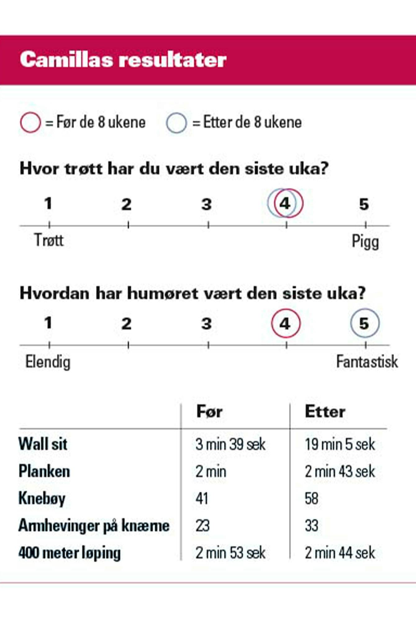 Både før og etter de 8 ukene fylte Camilla ut et kort spørreskjema, og personlig trener Christina Heick testet hennes styrke og kondisjon. Her ser du hvordan det gikk: