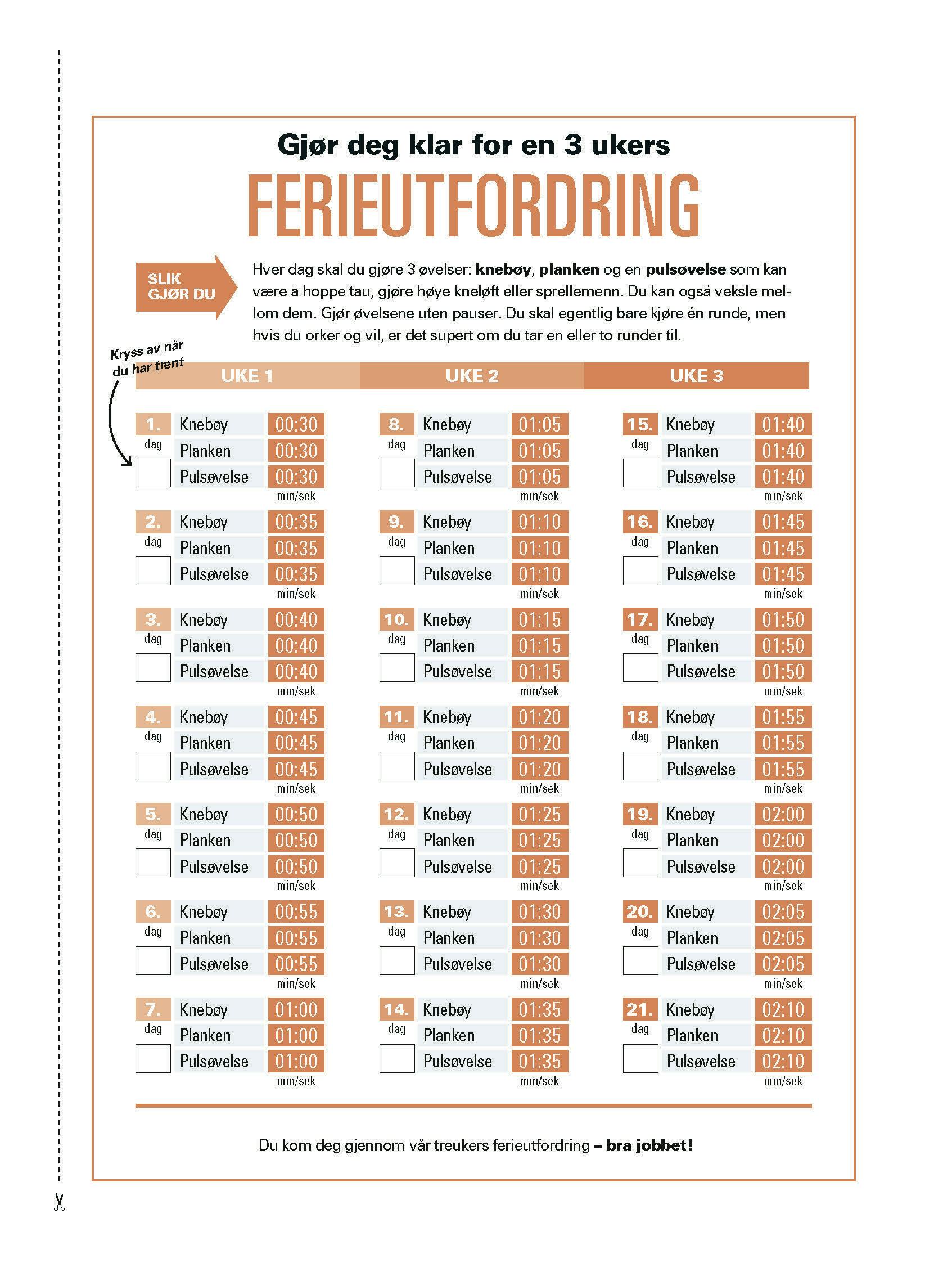 Hver dag legger vi til fem sekunder, slik at du den siste feriedagen skal gjøre hver øvelse i 2 minutter og 10 sekunder. Det er bra for motivasjonen å konkurrere med seg selv, og når den tid kommer, er du så sterk at det klarer du fint.